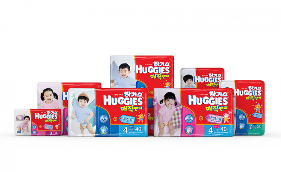 Huggies Magic Pants, produced by Yuhan Kimberly are underwear-type products for toddlers who still require the aid of a diaper. Every year, Yuhan Kimberly upgrades the function of their products and creates a new package design showcasing the features of the product. The recent design from 2014 was called "playsuit" and illustrated a diaper that perfectly fits the baby's body and is light weight as well, allowing the child to move around freely. As the product concept is renewed every year, the product needed a fresh iamge while still maintaining the Huggies classic image, for example, the signature red color.